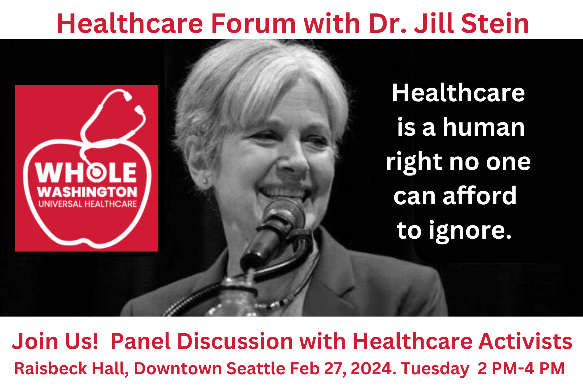 Join Whole Washington and the Green Party of Washington on Tuesday, Feb 27th for a panel forum with Green Party Presidential Candidate Dr. Jill Stein, Green Party Congressional Candidate (WA02) & Whole Washington Board member Jason Call (also Stein’s Campaign Manager), and other single-payer healthcare activists.
